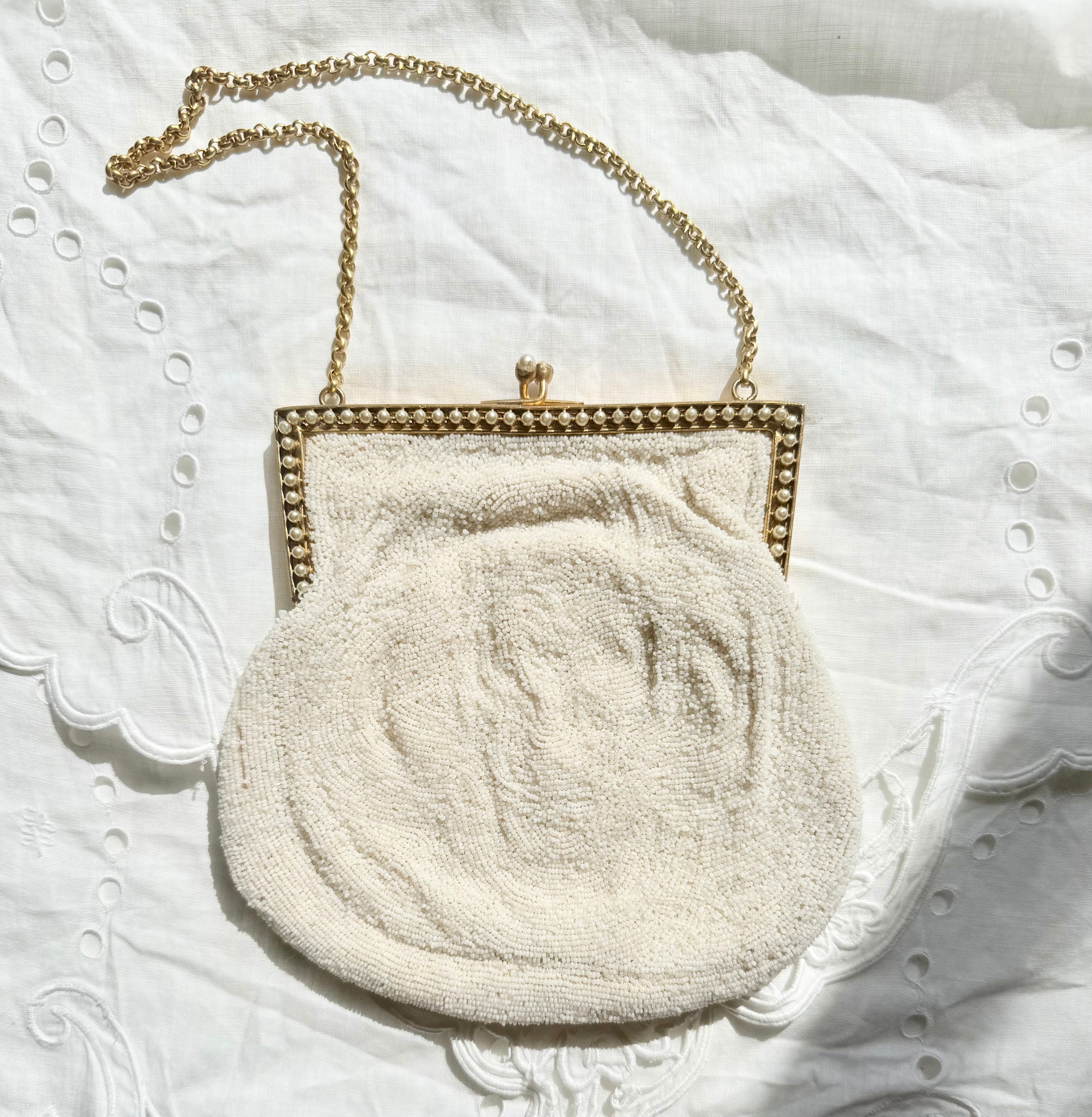 パールビーズで縁取られたマットゴールドの金具がとても可憐な佇まいです。